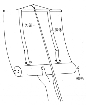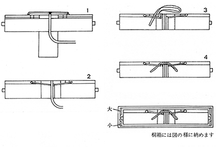 両手で軸先を持ち中央まで巻きあげます。左手で巻いた軸の中央部分を持ち右手で矢筈を使い釘からはずし畳の上で風帯を折りたたみ、軸を最後まで巻きます。次に巻紙を巻き掛紐(巻緒)を図の順序に巻き桐箱に納めて下さい。